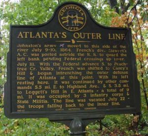 July 18. With the Federal advance S. to Peachtree Cr. Valley, French was shifted to Casey's Hill & began intrenching the outer defense line of Atlanta at this point. With its left resting here, it was continued by other commands 5.5 mi. E. to Highland Ave., & S. 3.5 mi. to Leggett's Hill in E. Atlanta -- a total of 9 mi. It was occupied by 3 infantry corps & State Militia. The line was vacated July 22 -- the troops falling back to the inner line.