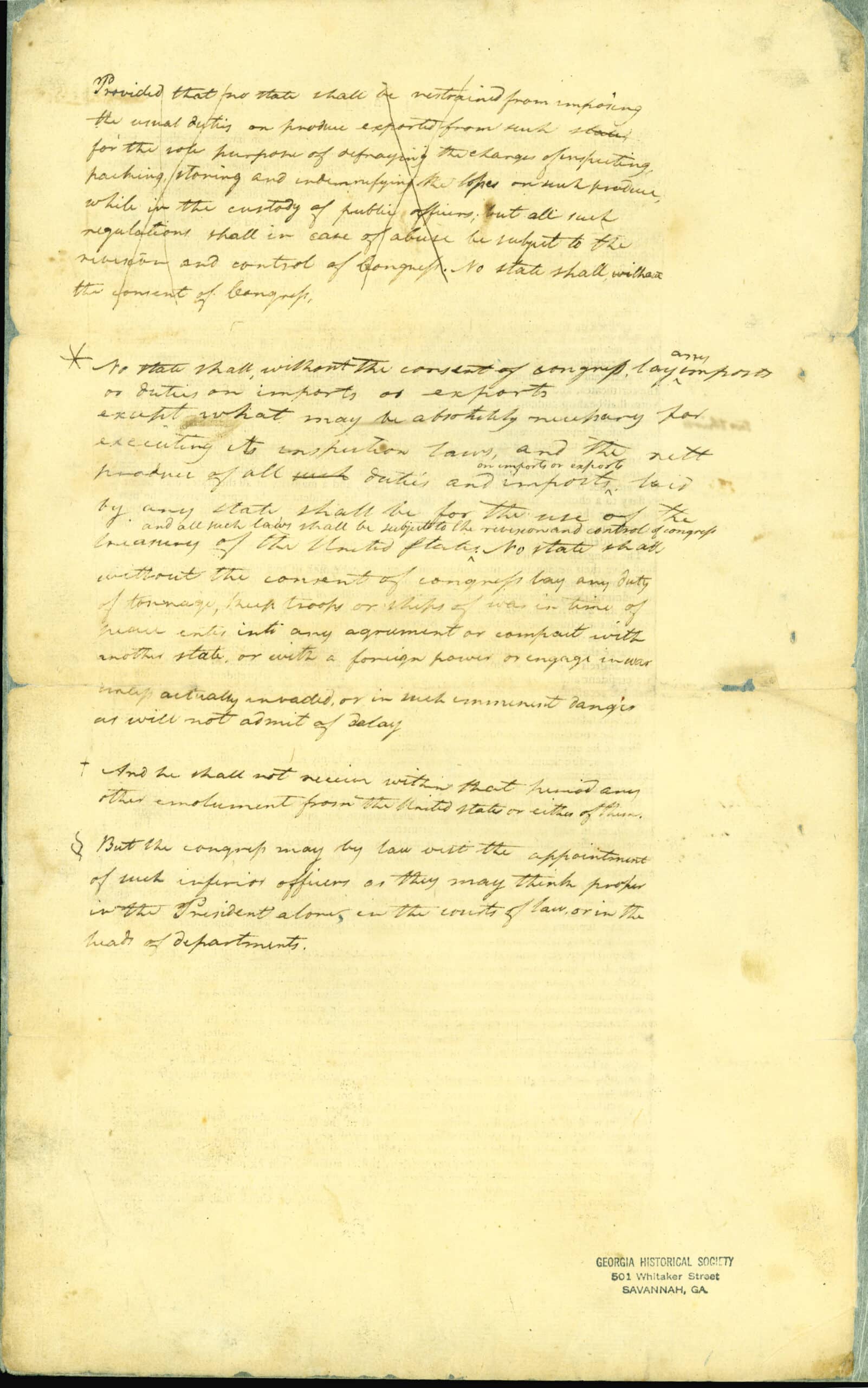 Few documents in American history are more iconic—or continue to have more impact on our daily lives—than the United States Constitution. This draft copy of the Constitution belonged to Georgia delegate Abraham Baldwin and is one of the crown jewels of the GHS collection. Baldwin, one of fifty-five delegates to the 1787 Convention, received this draft, printed by Dunlap and Claypoole, for review. This second printed draft of the Constitution, printed on four folio leaves complete with Baldwin’s signature and marginal notes, is one of only fourteen in existence. Baldwin’s annotations include deletions and additions that were included in the final version of the Constitution that was ratified by the Convention. It reflects the evolving collaborative approach of the framers that is also part of our collective heritage. Besides its significance as a priceless artifact, this rare document is crucial to understanding the development of our federal system of government.