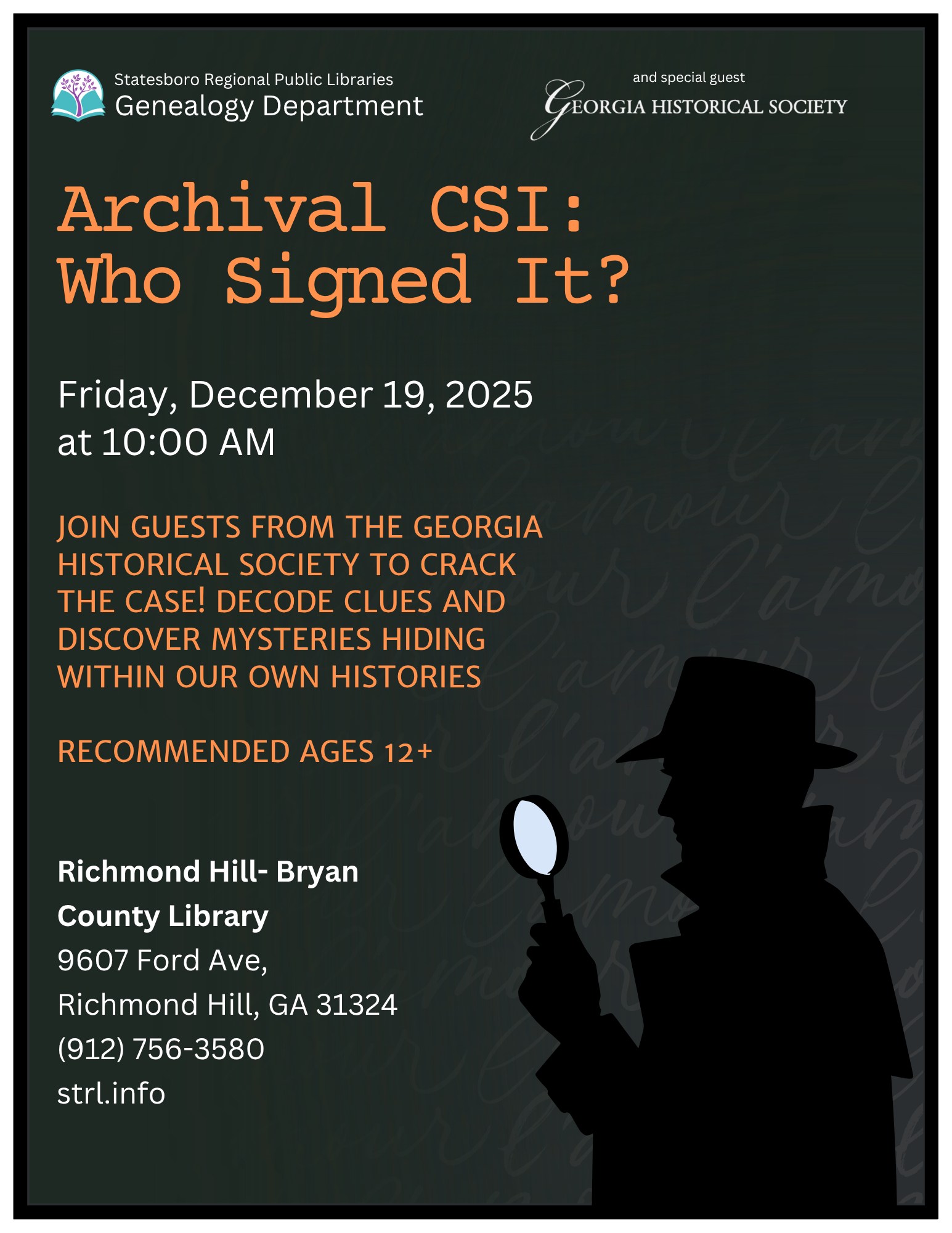 On December 19, GHS is pleased to join Statesboro Regional Public Libraries for a special program for teens. The program, Archival CSI: Who Signed It?, will take place at the Richmond Hill-Bryan County Library, 9607 Ford Ave, Richmond Hill, Georgia.