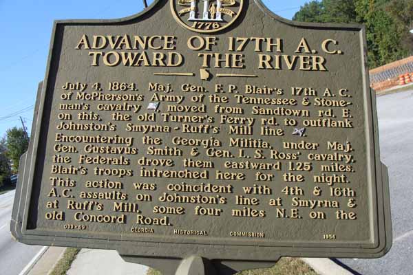 Marker Text*: July 4, 1864. Maj. Gen. F. P. Blair's 17th A. C. of McPherson's Army of the Tennessee & Stoneman's cavalry [US], moved from Sandtown rd. E. of this, the old Turner's Ferry rd. to outflank Johnston's Smyrna - Ruff's Mill line [CS].