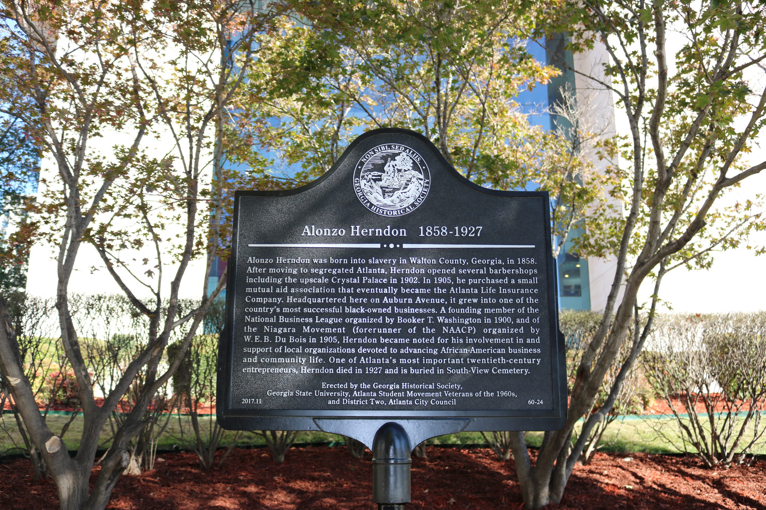 Marker Text: Alonzo Herndon was born into slavery in Walton County, Georgia, in 1858. After moving to segregated Atlanta, Herndon opened several barbershops including the upscale Crystal Palace in 1902. In 1905, he purchased a small mutual aid association that eventually became the Atlanta Life Insurance Company. Headquartered here on Auburn Avenue, it grew into one of the country's most successful black-owned businesses. A founding member of the National Business League organized by Booker T. Washington in 1900, and of the Niagara Movement (forerunner of the NAACP) organized by W. E. B. Du Bois in 1905, Herndon became noted for his involvement in and support of local organizations devoted to advancing African-American business and community life. One of Atlanta's most important twentieth-century entrepreneurs, Herndon died in 1927 and is buried in South-View Cemetery.