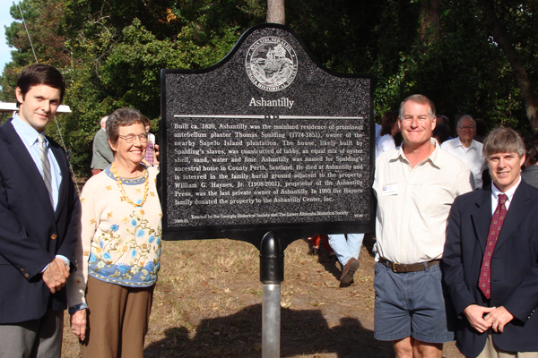 Marker Text: Built ca. 1820, Ashantilly was the mainland residence of prominent antebellum planter Thomas Spalding (1774-1851), owner of the nearby Sapelo Island plantation. The house, likely built by Spalding's slaves, was constructed of tabby, an equal mix of oyster shell, sand, water and lime. Ashantilly was named for Spalding's ancestral home in County Perth, Scotland. He died at Ashantilly and is interred in the family burial ground adjacent to the property. William G. Haynes, Jr. (1908 - 2001), proprietor of the Ashantilly Press, was the last private owner of Ashantilly. In 1993 the Haynes family donated the property to the Ashantilly Center, Inc.
