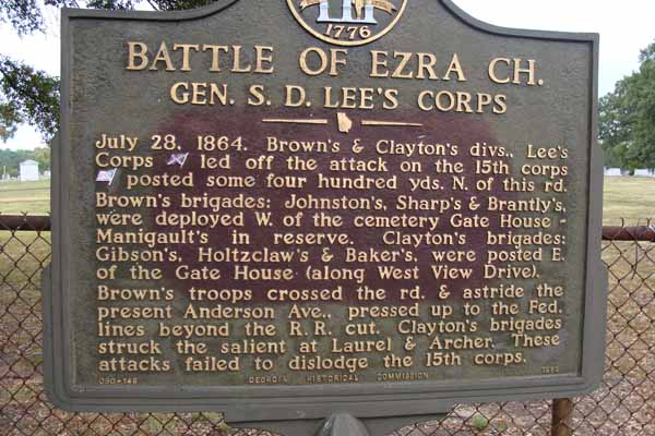 Marker Text: July 28, 1864. Brown's & Clayton's divs., Lee's Corps [CS] led off the attack on the 15th corps [US] posted some four hundred yards N. of this rd. Brown's brigades: Johnston's, Sharp's & Brantly's, were deployed W. of the cemetery Gate House -- Manigualt's in reserve. Clayton's brigades: Gibson's, Holtzsclaw's and Baker's were posted E. of the Gate House (along West View Drive). Brown's troops crossed the rd. & astride the present Anderson Ave., pressed up to the Fed. lines beyond the R.R. cut. Clayton's brigades struck the salient at Laurel & Archer. These attacks failed to dislodge the 15th corps.