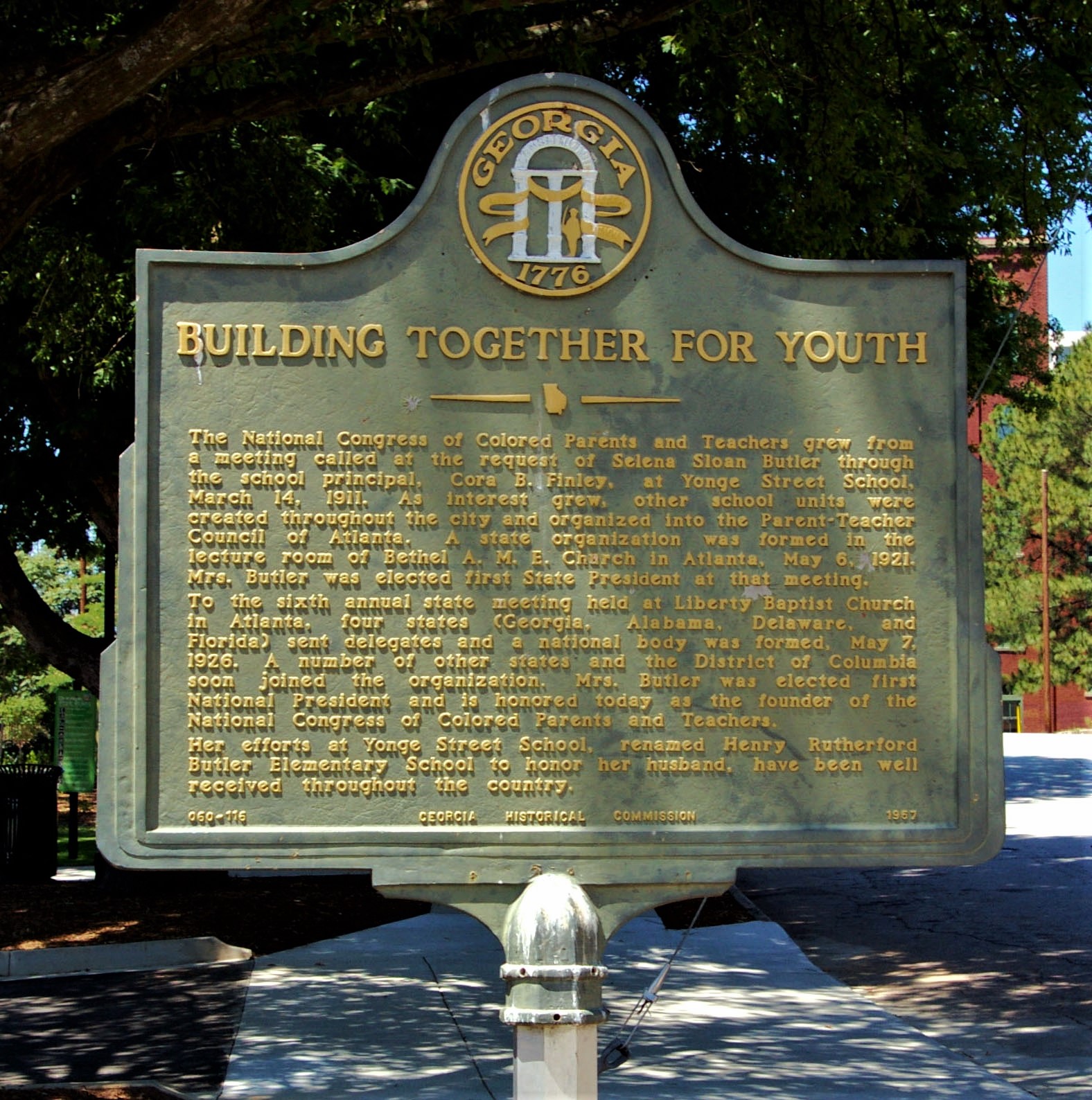 Marker Text: The National Congress of Colored parents and teachers grew from a meeting called at the request of Selena Sloan Butler through the school principal, Cora B. Finley, at Yonge Street School, March 14, 1911. As interest grew, other school units were created throughout the city and organized into the Parent-Teacher Council of Atlanta. A state organization was formed in the lecture room of Bethel A. M. E. Church in Atlanta, May 6, 1921. Mrs. Butler was elected first State President at that meeting.