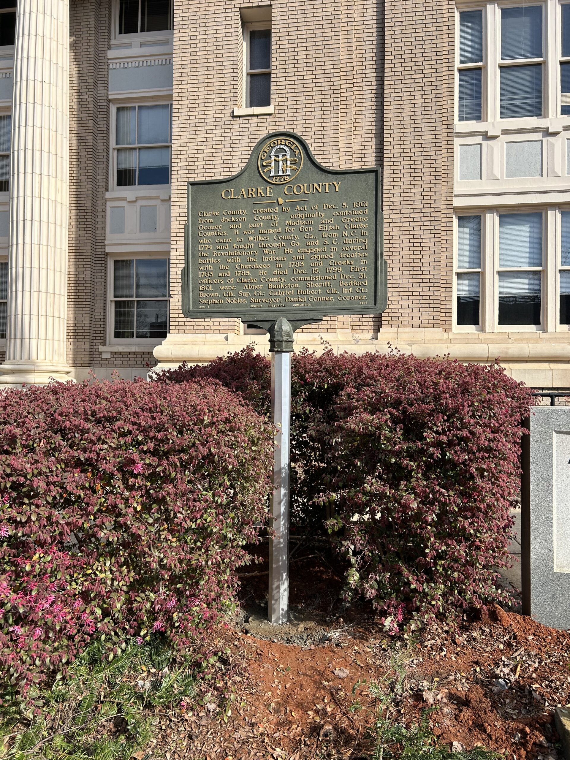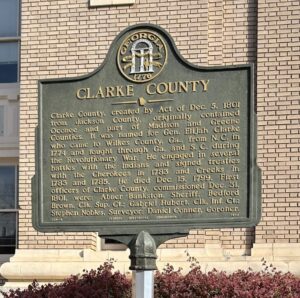 Marker Text: Clarke County, created by Act of Dec. 5, 1801 from Jackson County, originally contained Oconee and part of Madison and Greene Counties. It was named for Gen. Elijah Clarke who came to Wilkes County, Ga., from N.C. in 1774 and fought through Ga., and S.C. during the Revolutionary War. He engaged in several battles with the Indians and signed treaties with the Cherokees in 1783 and Creeks in 1783 and 1785. He died Dec. 15, 1799. First officers of Clarke County, commissioned Dec. 31, 1801, were: Abner Bankston, Sheriff; Bedford Brown, Clk, Sup. Ct.; Gabriel Hubert, Clk. Inf. Ct.; Stephen Nobles, Surveyor; Daniel Conner, Coroner.