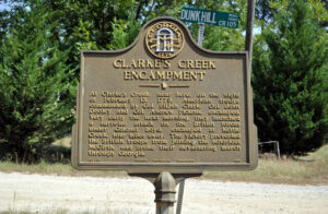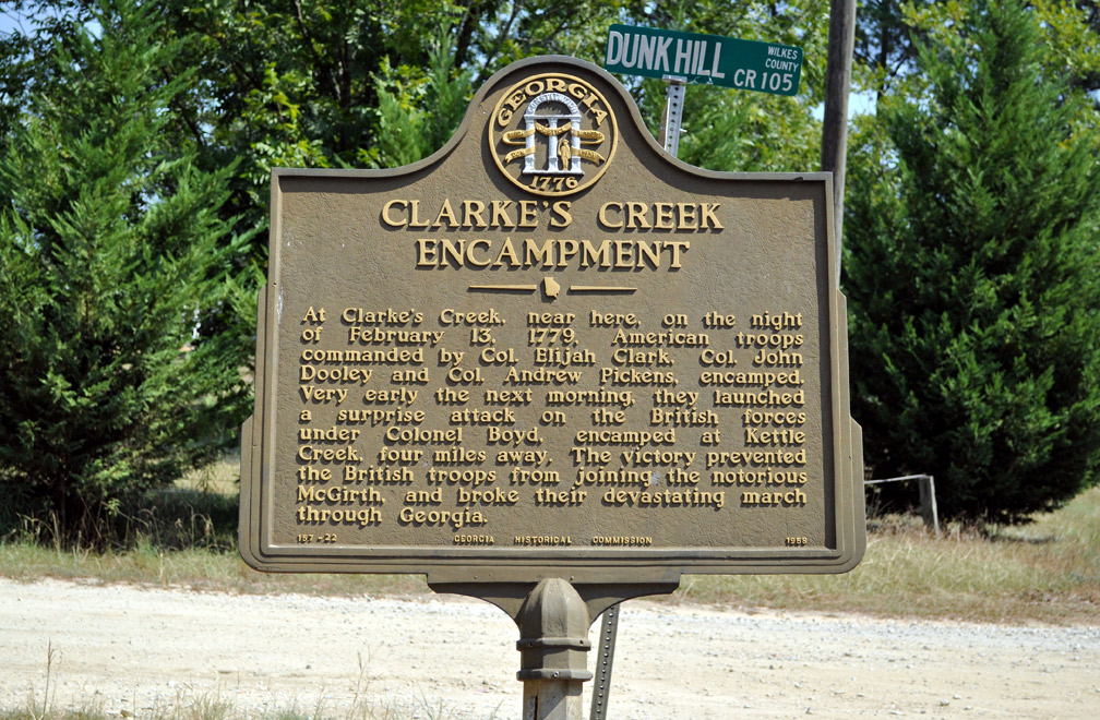 Marker Text: At Clarke's Creek, near here, on the night of February 13, 1779, American troops commanded by Col. Elijah Clarke, Col. John Colley and Col. Andrew Pickens, encamped. Very early the next morning, they launched a surprise attack on the British forces under Colonel Boyd, encamped at Kettle Creek, 4 miles a way. The victory prevented the British troops from joining the notorious McGirth, and broke their devastating march through Georgia.