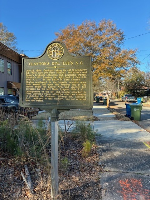 Marker Text: July 28, 1864. Deployed along the old Greensferry Rd. (West View Dr.) were Gibson's Holtzclaw's and Baker's brigades (Alabama and Louisiana troops), Clayton's div., forming the right flank of General S.D. Lee's A. C. [CS] in the Battle Of Ezra Church.