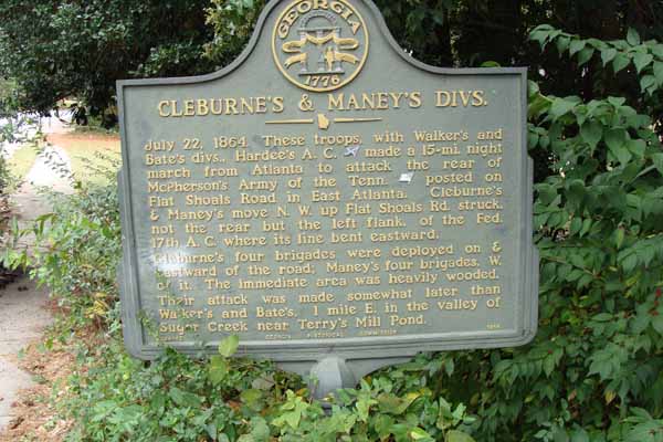Marker Text: July 22, 1864. These troops, with Walker's and Bate's divs., Hardee's A.C. [CS] made a 15-mi. night march from Atlanta to attack the rear of McPherson's Army of the Tenn. [US] posted on Flat Shoals Road in East Atlanta. Cleburne's & Maney's move N.W. up Flat Shoals Rd. struck, not the rear but the left flank, of the Fed. 17th A.C. where its line bent eastward.