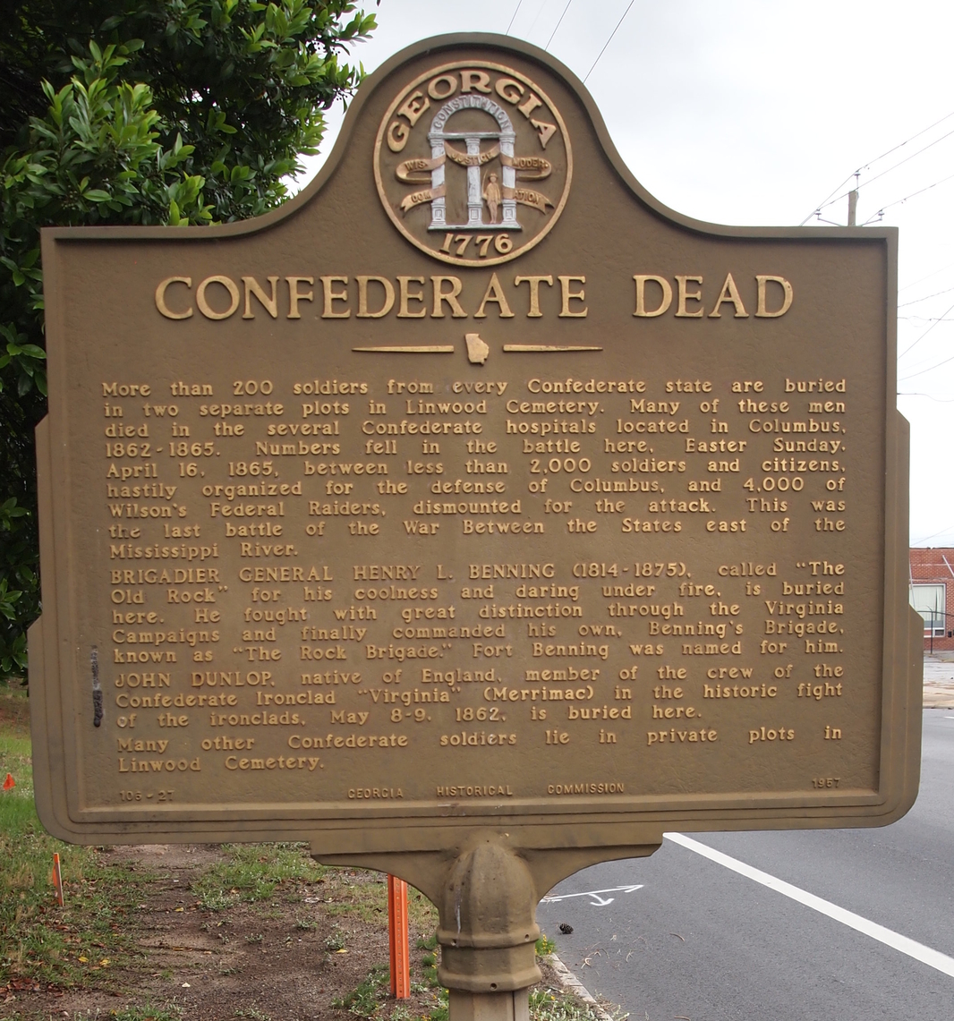 Marker Text: More than 200 soldiers from every Confederate state are buried in two separate plots in Linwood Cemetery. Many of these men died in the several Confederate hospitals located in Columbus, 1862-1865. Numbers fell in battle here, Easter Sunday, April 16, 1865, between less than 2,000 soldiers and citizens, hastily organized for the defense of Columbus, and 4,000 of Wilson's Federal Raiders, dismounted for the attack. This was the last battle of the War Between the States east of the Mississippi River.