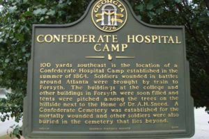 Marker Text: 100 yards southeast is the location of a Confederate Hospital Camp established in the summer of 1864. Soldiers wounded in battles around Atlanta were brought by train to Forsyth. The buildings at the college and other buildings in Forsyth were soon filled and tents were pitched among the trees on the hillside next to the Home of Dr. A.H. Sneed. A Confederate Cemetery was established for the mortally wounded and other soldiers were also buried in the cemetery that lies beyond.