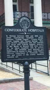 Marker Text: In Newnan between 1862 and 1865 were seven Confederate hospitals -- Bragg, Buckner, "College Temple," "Coweta House," Foard, Gamble and Pinson's Springs. More than 10,000 Confederate sick and wounded and about 200 Federal soldiers wounded in the Battle at Brown's Mill were cared for in these hospitals and in private homes. The hospitals were directed and supervised by Samuel H. Stout, Army Medical Director Department of Tennessee. Loyal men and women of the county rendered valuable aid.