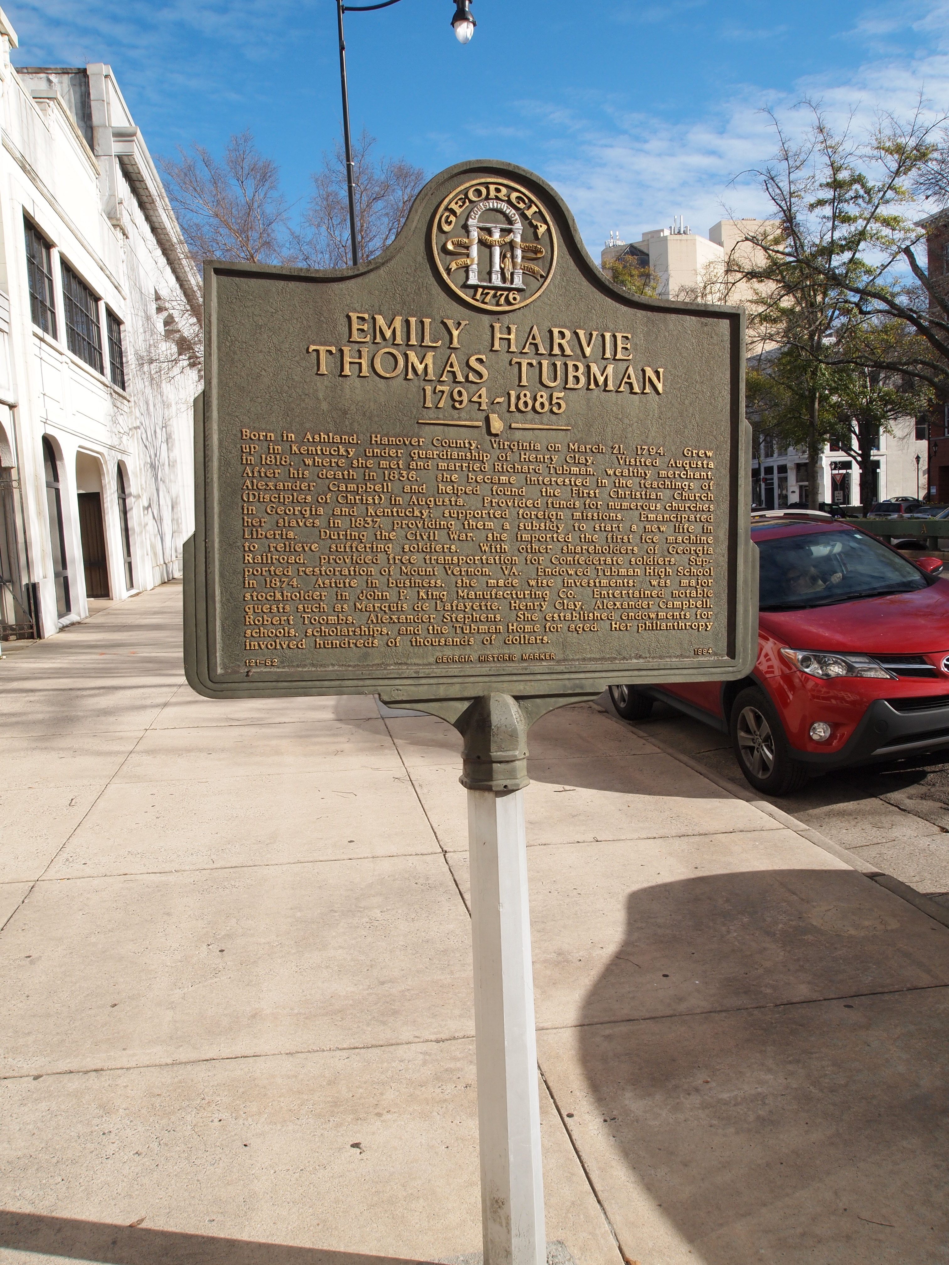 Marker Text: Born in Ashland, Hanover County, Virginia on March 21, 1794. Grew up in Kentucky under guardianship of Henry Clay. Visited Augusta in 1818, where she met and married Richard Tubman, wealthy merchant. After his death in 1836, she became interested in the teachings of Alexander Campbell and helped found the First Christian Church (Disciples of Christ) in Augusta. Provided funds for numerous churches in Georgia and Kentucky; supported foreign missions. Emancipated her slaves in 1837, providing them a subsidy to start a new life in Liberia. During the Civil War, she imported the first ice machine to relieve suffering soldiers. With other shareholders of Georgia Railroad, provided free transportation for Confederate soldiers. Supported restoration of Mount Vernon, VA. Endowed Tubman High School in 1874. Astute in business, she made wise investments; was major stockholder in John P. King Manufacturing Co. Entertained notable guests such as Marquis de Lafayette, Henry Clay, Alexander Campbell, Robert Toombs, Alexander Stephens. She established endowments for schools, scholarships, and the Tubman Home for the aged. Her philanthropy involved hundreds of thousands of dollars.