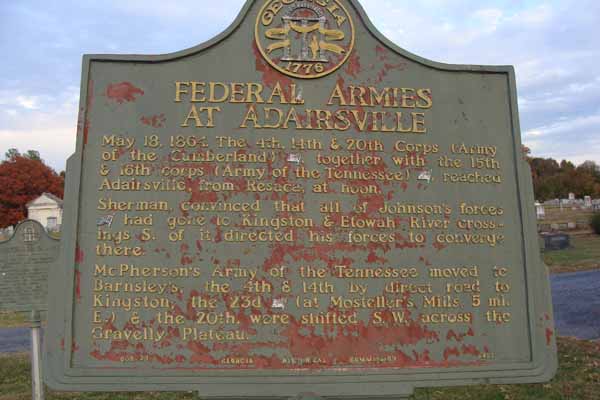 Marker Text: May 18, 1864. The 4th, 14th & 20th Corps (Army of the Cumberland) [USA], together with the 15th & 16th corps (Army of the Tennessee) [USA], reached Adairsville from Resaca, at noon.