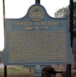 Marker Text: A short distance East on this road is Fender Cemetery, in which are buried many of the first settlers of the area of old Lowndes County lying East of the Alapaha River, from Union Church. This location for the Cemetery was chosen because of the inconvenience of ferrying the bodies of the dead across the river for burial. As the grounds were on lands of David Fender, the cemetery was given his family name. The earliest marked grave is that of Josiah Sirmans, one of the organizers of Union Church, who died Jan. 6 1830. Fender Cemetery was first in Lowndes, then Clinch, and is now in Lanier County.
