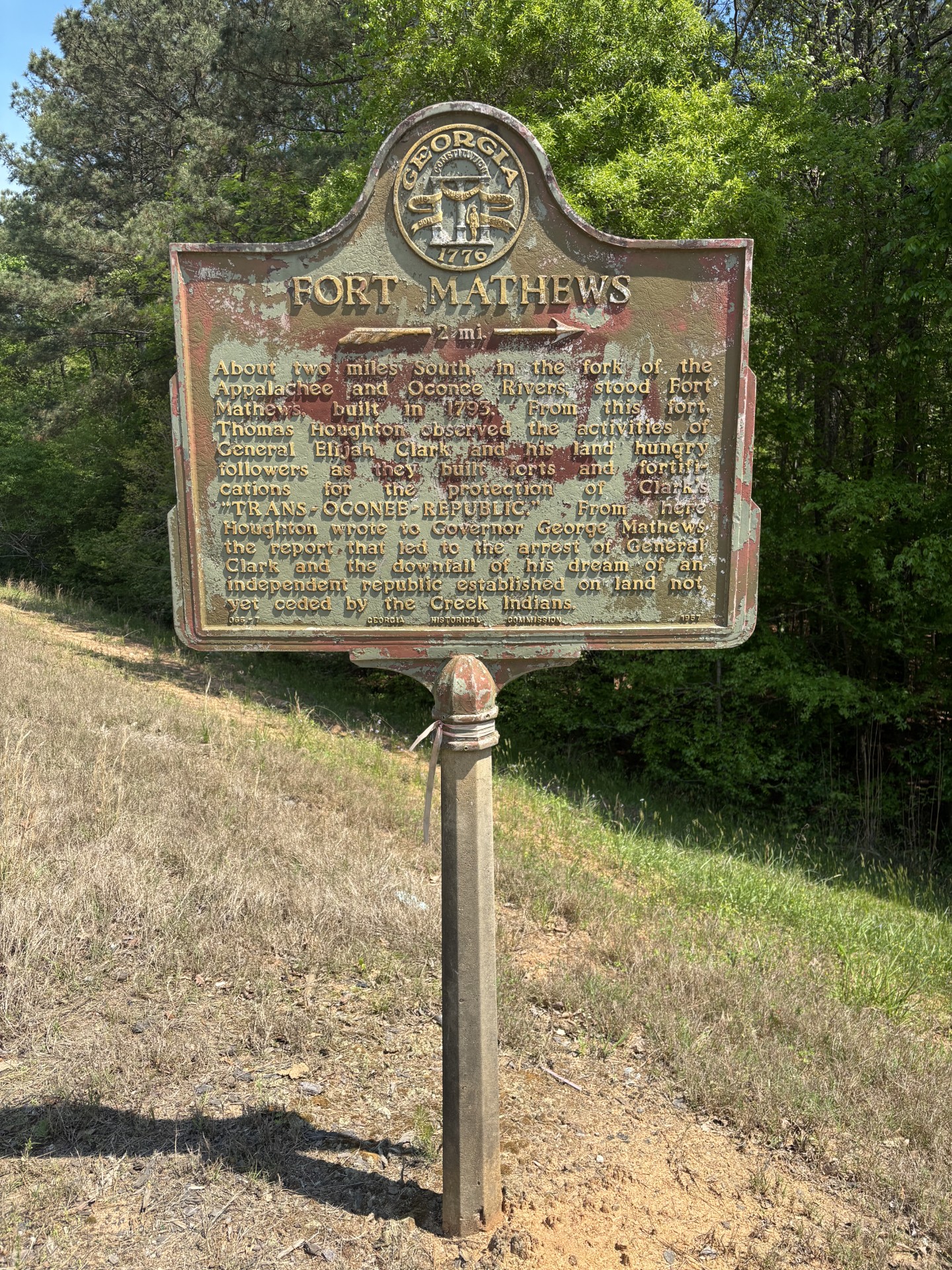 Marker Text: About two miles South, in the fork of the Appalachee and Oconee rivers, stood Fort Mathews, built in 1793. From this fort, Thomas Houghton observed the activities of General Elijah Clark and his land hungry followers as they built forts and fortifications for the protection of Clark´s "TRANS-OCONEE-REPUBLIC." From here Houghton wrote to Governor George Mathews the report that led to the arrest of General Clark and the downfall of his dream of an independent republic established on land not yet ceded by the Creek Indians.