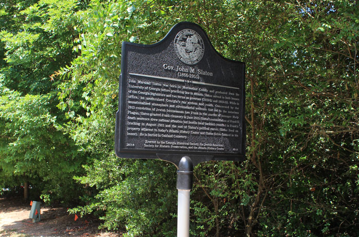 Marker Text: John Marshall Slaton was born in Meriwether County and graduated from the University of Georgia before practicing law in Atlanta. Slaton served in both houses of the Georgia legislature and two terms as governor (1911-12 and 1913-15). While in office, he modernized Georgia’s tax system and roads. Concerned by the sensationalized atmosphere and circumstantial evidence that led to the notorious 1913 conviction of Jewish businessman Leo Frank in the murder of teenager Mary Phagan, Slaton granted Frank clemency in June 1915. Slaton’s commutation of Frank’s death sentence drew national attention but hostile local backlash resulted in Frank’s lynching in August 1915 and the end of Slaton’s political career. Slaton lived on property adjacent to today’s Atlanta History Center and Slaton Drive (named in his honor). He is buried in Oakland Cemetery.