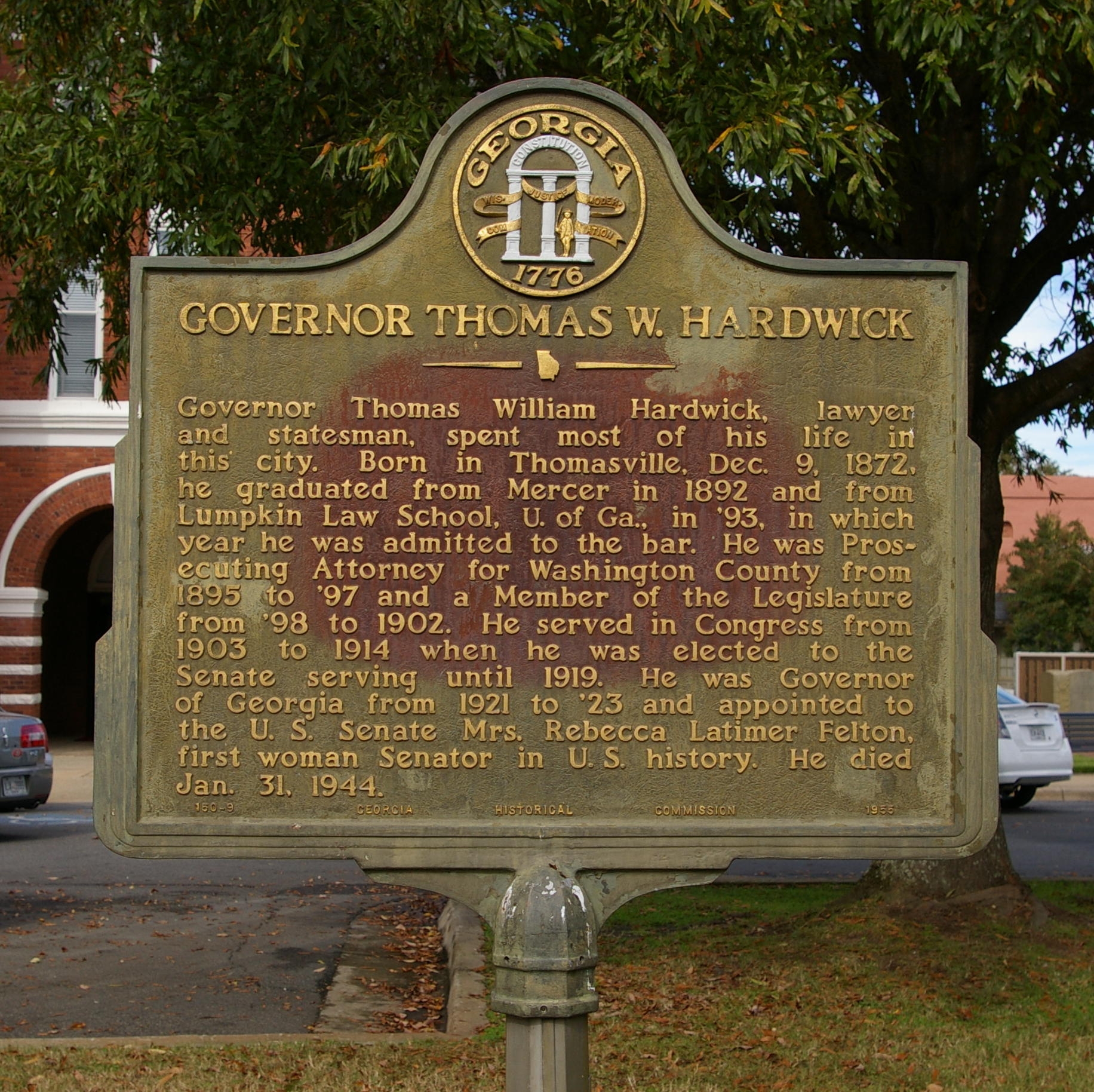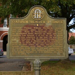 Marker Text: Governor Thomas William Hardwick, lawyer and statesman, spent most of his life in this city. Born in Thomasville, Dec. 9, 1872, he graduated from Mercer in 1892 and from Lumpkin Law School, U. of Ga., in ‘93, in which year he was admitted to the bar. He was Prosecuting Attorney for Washington County from 1895 to ‘97 and a Member of the Legislature from ‘98 to 1902. He served in Congress from 1903 to 1914 when he was elected to the Senate serving until 1919. He was Governor of Georgia from 1921 to ‘23 and appointed to the U.S. Senate Mrs. Rebecca Latimer Felton, first woman Senator in U.S. history. He died Jan. 31, 1944.