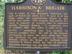 Marker Text: The 5 regts. of Col. Benjamin Harrison's brigade of Ward's div. (20th A.C.) (US) were N. of this ridge when the Confederate attack in this sector was made. The brigade was moved forward in support of Geary's line & deployed astride Tanyard Branch -- 2 regiments west of Collier's Mill; the other 3 east of it.