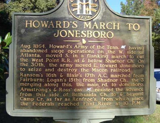 Marker Text: Aug. 1864. Howard's Army of the Tenn. (US), having abandoned siege operations on the W. side of Atlanta, moved S. in a flanking march to cut the West Point R.R. at & below Shadnor Ch. On the 30th, the army moved E. toward Jonesboro to seize and destroy the Macon railroad.