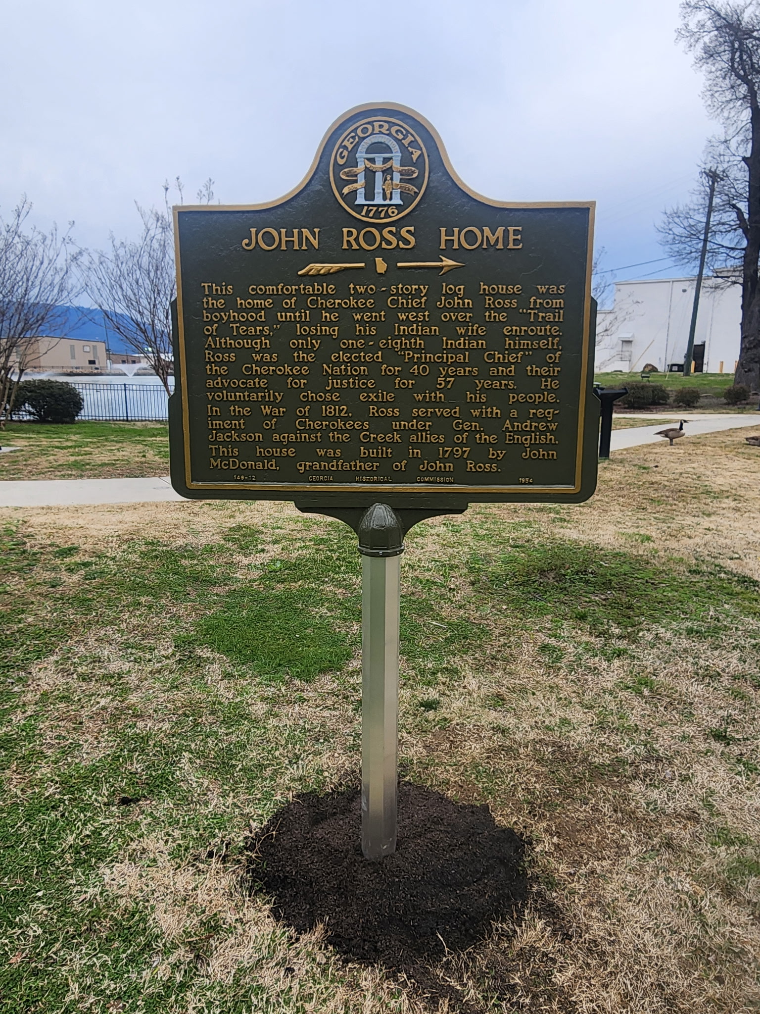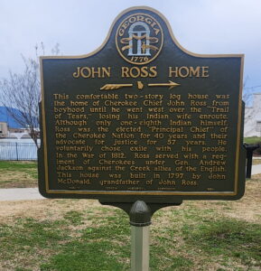 Marker Text: This comfortable two-story log house was the home of Cherokee Chief John Ross from boyhood until he went west over the "Trail of Tears," losing his Indian wife enroute. Although only one-eighth Indian himself, Ross was the elected "Principal Chief" of the Cherokee Nation for 40 years and their advocate for justice for 57 years. He voluntarily chose exile with his people. In the war of 1812, Ross served with a regiment of Cherokees under Gen. Andrew Jackson against the Creek allies of the English. This house was built in 1797 by John McDonald, grandfather of John Ross.