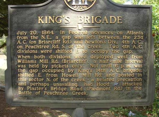 When both divisions were deployed west from Williams Mill Rd. (Briarcliff), a half-mile interval was held by pickets only. Not until 6 p.m. was the gap occupied by King's 14th A.C. brigade, shifted E. from Howell Mill Rd. and posted in this sector N. of the creek -- a belated precaution and perhaps unavailing, had Hood (CS) attacked by Plaster's Bridge Road (Piedmont Rd.) in the Battle of Peachtree Creek.