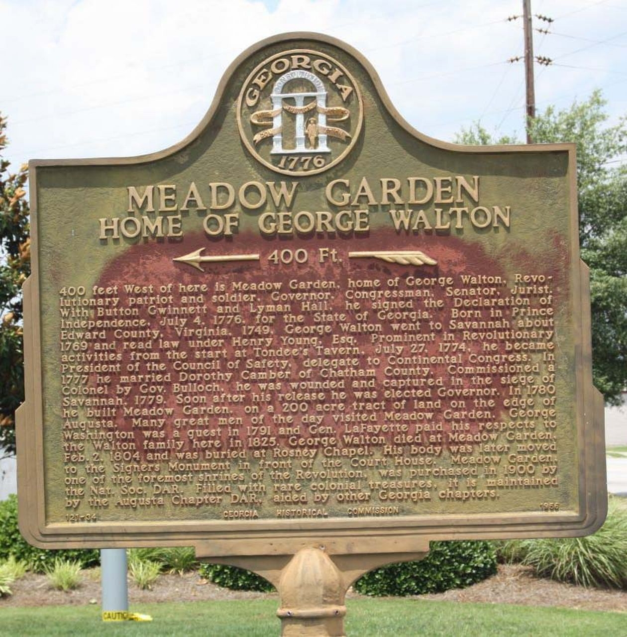 Marker Text:  400 feet west of here is Meadow Garden, home of George Walton, Revolutionary Patriot and soldier, Governor, Congressman, Senator, Jurist. With Button Gwinnett and Lyman Hall, he signed the Declaration of Independence, July 4, 1776, for the State of Georgia. Born in Prince Edward County, Virginia, 1749, George Walton went to Savannah about 1769 and read law under Henry Young, Esq. Prominent in Revolutionary activities from the start at Tondee’s Tavern, July 27, 1774, he became President of the Council of Safety, delegate to Continental Congress. In 1777 he married Dorothy Camber of Chatham County. Commissioned a Colonel by Gov. Bulloch, he was wounded and captured in the siege of Savannah, 1779. Soon after his release he was elected Governor. In 1780 he built Meadow Garden, on a 200 acre tract of land on the edge Augusta. Many great men of the day visited Meadow Garden. George Washington was a guest here in 1791 and Gen. LaFayette paid his respects to the Walton family here in 1825. George Walton died at Meadow Garden, February 2, 1804 and was buried at Rosney Chapel. His body was later moved to the Signers Monument in front of the Courthouse. Meadow Garden, one of the foremost shrines of the Revolution, was purchased in 1900 by the Nat. Soc. DAR. Filled with rare colonial treasures, it is maintained by the Augusta Chapter DAR, aided by other Georgia chapters.