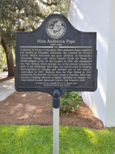 Marker Text: A pioneer in women's education, Nina Anderson Pape completed her studies at Columbia University. She founded the Froebel Circle, which educated the poor children of Savannah's Yamacraw Village; and Tybee Island's Fresh Air Home for disadvantaged youth. At this location in 1905, she established the Pape School, which became one of the premier schools for girls in the Southeast. Miss Pape was instrumental in bringing kindergartens to Georgia and included one in her school's curriculum in 1911. Students from the Pape School in 1912 comprised the first two Girl Scout troops in America. Miss Pape became a leading advocate of higher education for women. The Pape School became Savannah Country Day School in 1955.