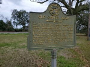 Marker Text: The Old Coffee Road, earliest vehicular and postal route of this section, crossed here, running southwestward from the Ocmulgee River via today’s Lax, Nashville, Cecil, Barwick and Thomasville to the Florida line above Tallahassee. This thoroughfare was opened by direction of the State in 1823 under supervision of Gen. John Coffee and Thomas Swain. As a pioneer route this highway played a significant part in the settlement and development of this region. Much of the old way remains in use today.