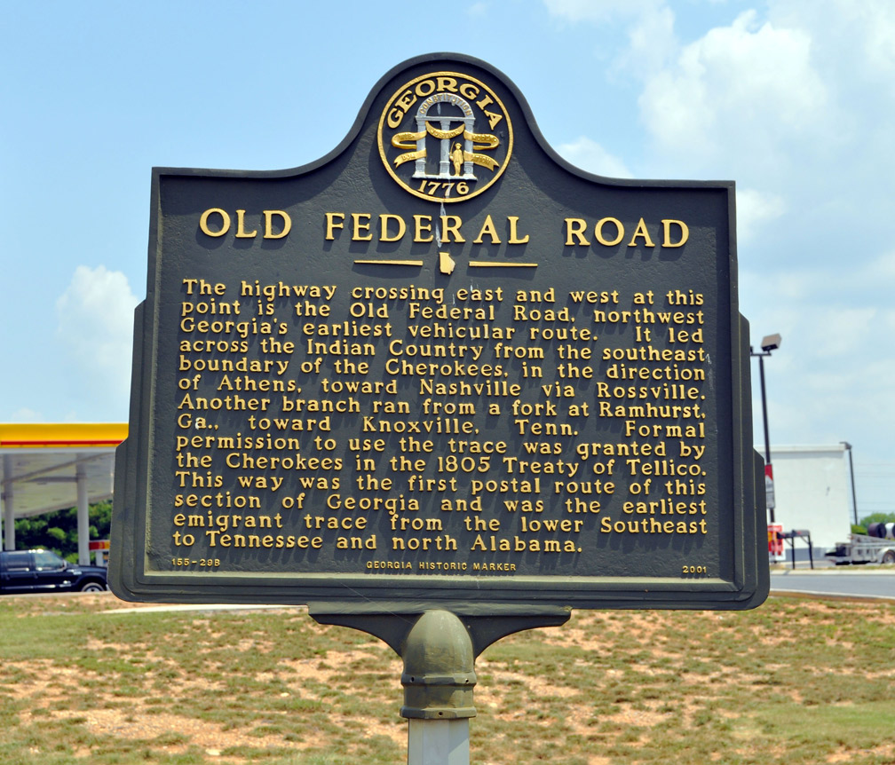 Marker Text: The highway crossing east and west at this point is the Old Federal Road, northwest Georgia’s earliest vehicular route. It led across the Indian County from the southeast boundary of the Cherokees, in the direction of Athens, toward Nashville via Rossville. Another branch ran from a fork at Ramhurst, Ga., toward Knoxville, Tenn. Formal permission to use the trace was granted by the Cherokees in the 1805 Treaty of Tellico. This way was the first postal route of this section of Georgia and was the earliest emigrant trace from the lower Southeast to Tennessee and north Alabama.