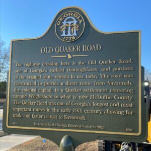 Marker Text: The highway crossing here is the Old Quaker Road, one of Georgia's earliest vehicular thoroughfares, and portions of the original route remain in use today. The road was constructed to provide a direct route from Savannah, the colonial capital, to a Quaker settlement centering around Wrightsboro in what is now McDuffie County. The Quaker Road was one of Georgia's longest and most important routes in the early 19th century, allowing for trade and faster transit to Savannah.