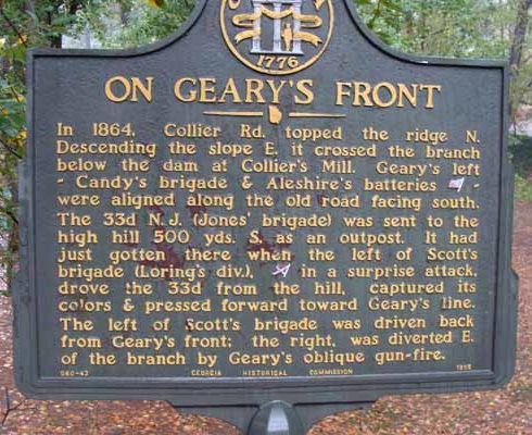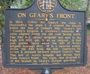 Marker Text: In 1864, Collier Rd. topped the ridge N. Descending the slope E. it crossed the branch below the dam at Collier's Mill. Geary's left -- Candy's brigade & Aleshire's batteries (US) -- were aligned along the old road facing south.