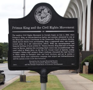Marker text: The modern Civil Rights Movement in Georgia began on July 4, 1944, when Primus E. King, an African-American barber and minister, attempted to vote at the Muscogee County Courthouse in the Democratic Party’s primary election, which barred blacks from participating. King, a registered voter, was roughly turned away by a law enforcement officer. With the encouragement and financial backing of local activist Dr. Thomas Brewer, King filed suit in Federal court in Macon, arguing that excluding black voters was unconstitutional. The court ruled in King’s favor, as did the U.S. Circuit Court of Appeals, ending Georgia’s “whites only” primary. King’s challenge eliminated the legal barriers to black voting in Georgia’s state and local elections and set in motion a statewide black voter registration campaign that helped end disfranchisement and the system of Jim Crow discrimination.