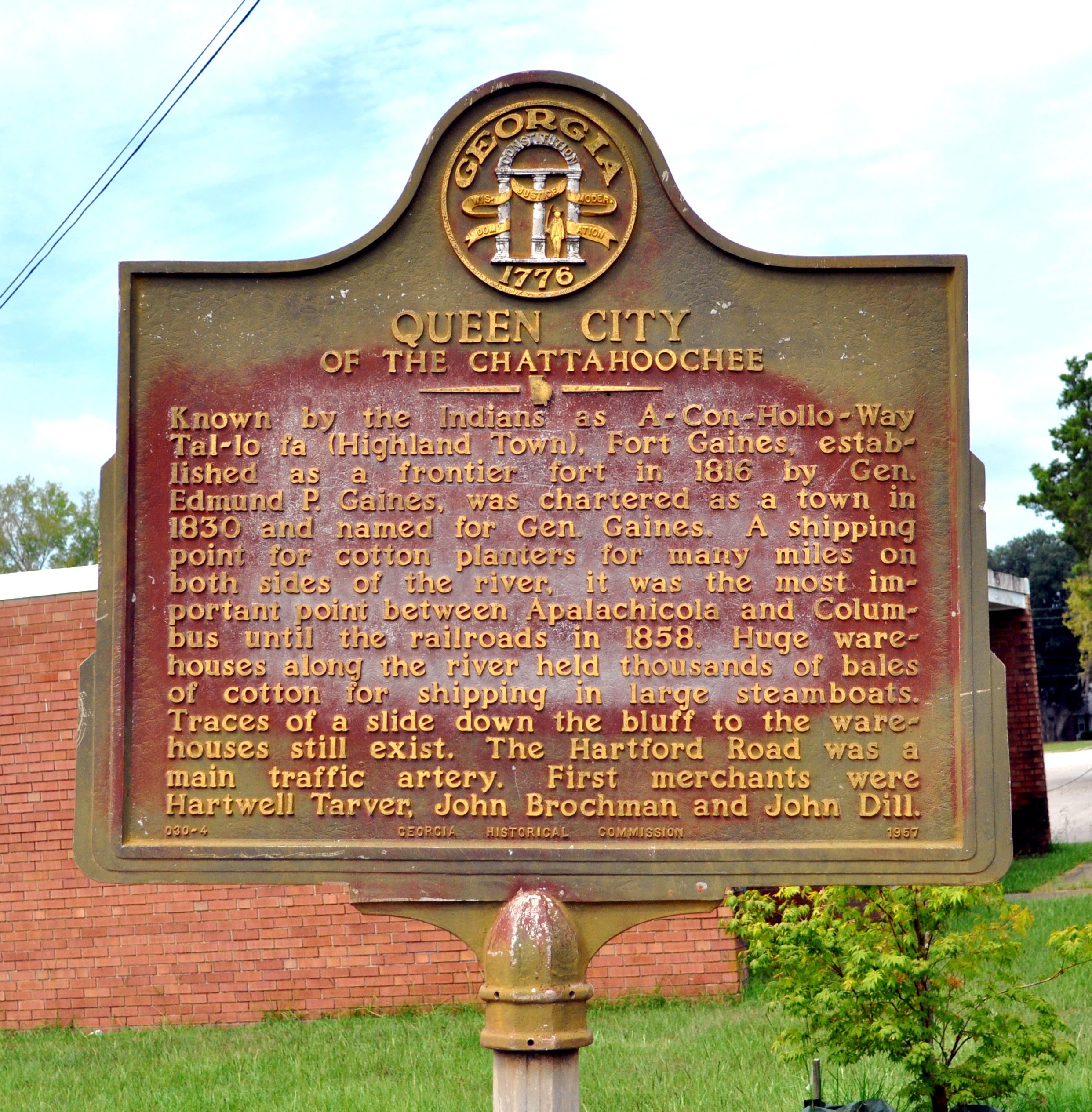 Marker Text: Known by the Indians as A-Con-Hollo-Way Tal-lo fa (Highland Town), Fort Gaines, established as a frontier fort in 1816 by Gen. Edmund P. Gaines, was chartered as a town in 1830 and named for Gen Gaines. A shipping point for cotton planters for many miles on both sides of the river, it was the most important point between Apalachicola and Columbus until the railroads in 1858. Huge warehouse along the river held thousands of bales of cotton for shipping in large steamboats. Traces of a slide down the bluff to the warehouses still exist. The Hartford Road was a main traffic artery. First merchants were Hartwell Tarver, John Brochman and John Dill.