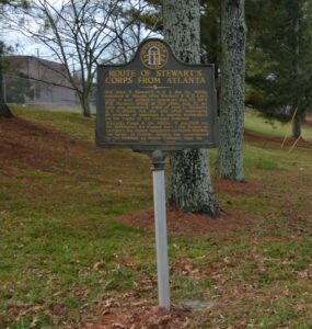 Marker Text: Gen. Alex P. Stewart's A.C. & the Ga. Militia remained in Atlanta after Hardee's and S.D. Lee's corps (CS) were shifted to Jonesboro Aug. 30, 1864. With Hardee's defeat at that place Aug. 31, Atlanta was abandoned, night of Sept. 1. Stewart's A.C. & Militia left the city after destroying 81 carloads of munitions & several locomotives on the tracks of the Georgia Railroad.