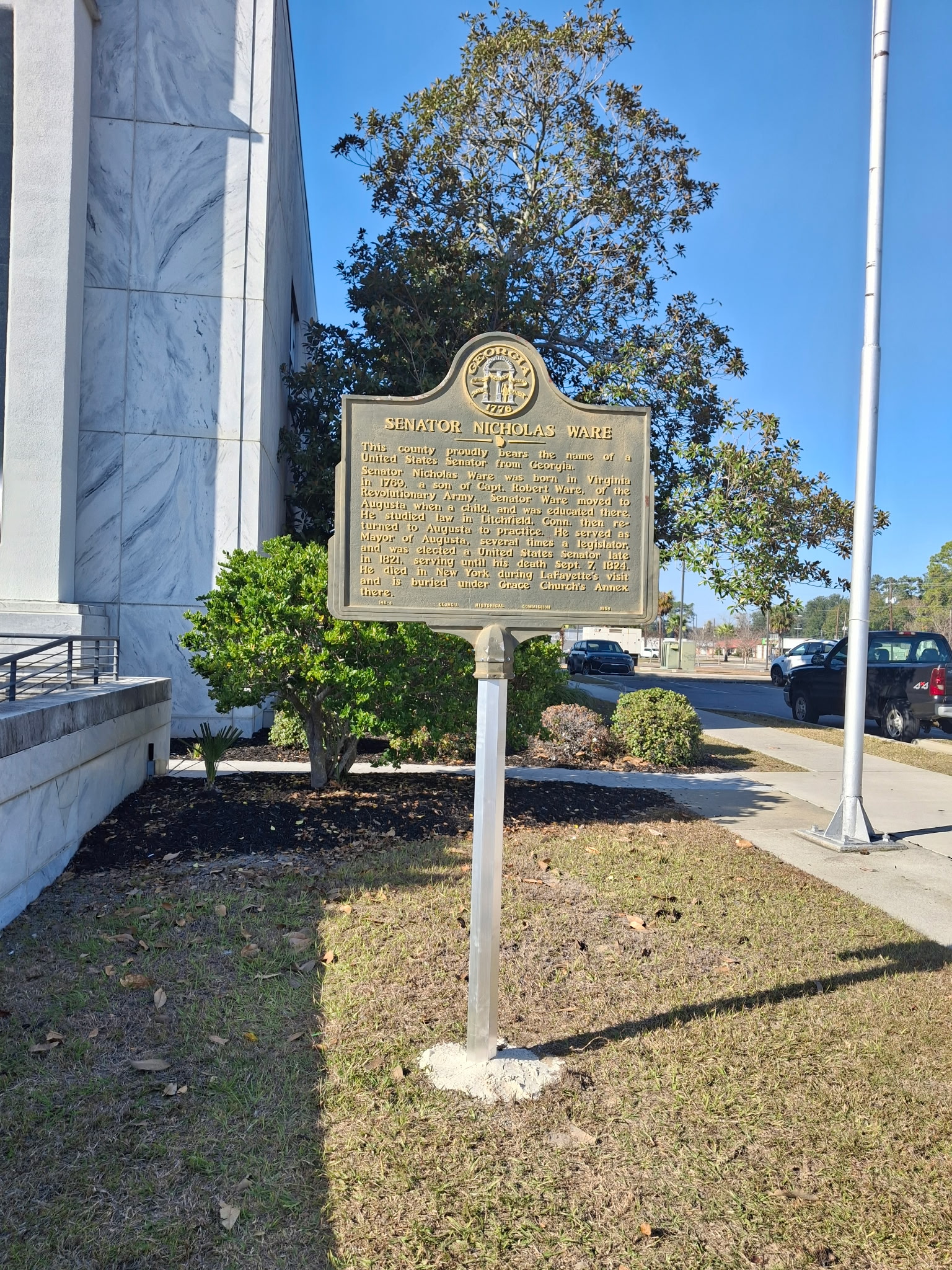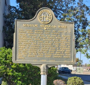 Senator Nicholas Ware was born in Virginia in 1769, a son of Capt. Robert Ware, of the Revolutionary Army. Senator Ware moved to Augusta when a child, and was educated there. He studied law in Litchfield, Conn. then returned to Augusta to practice. He served as Mayor of Augusta, several times a legislator, and was elected a United States Senator late in 1821, serving until his death Sept. 7, 1824. He died in New York during LaFayette's visit and is buried under Grace Church`s Annex there.