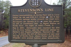 Marker Text: During demonstrations on Rocky Face and in Crow Valley, by 4th and 23d A.C. troops [US], the N. line of Dalton's defense works crossed the road here. Stevenson's div. (Hood's A.C.) [CS] held this sector, his left at Cheatham's line, at Signal Station on Rocky Face; his right at Ault's Creek, E.