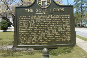 Marker Text: On Nov. 29, 1864, Jackson's and Geary's divisions, 20th Corps (Williams), of Gen. Sherman's army [USA], destroyed the railroad from Spier's Turnout (Bartow), No. 11, CRR, through Bethany (Wadley), No. 10 1/2, CRR, to the Ogeechee River. Next morning, both the railway and wagon bridges east of Bethany having been burned by the Confederate defenders, Jackson and Geary marched up the west bank and crossed the Ogeechee River at Cowart's bridge, 2.5 miles SE of Louisville, then turned east to Eden Church, on Big Creek, where they rejoined Ward's division and the corps trains which had moved on the direct road through Davisboro and Louisville.