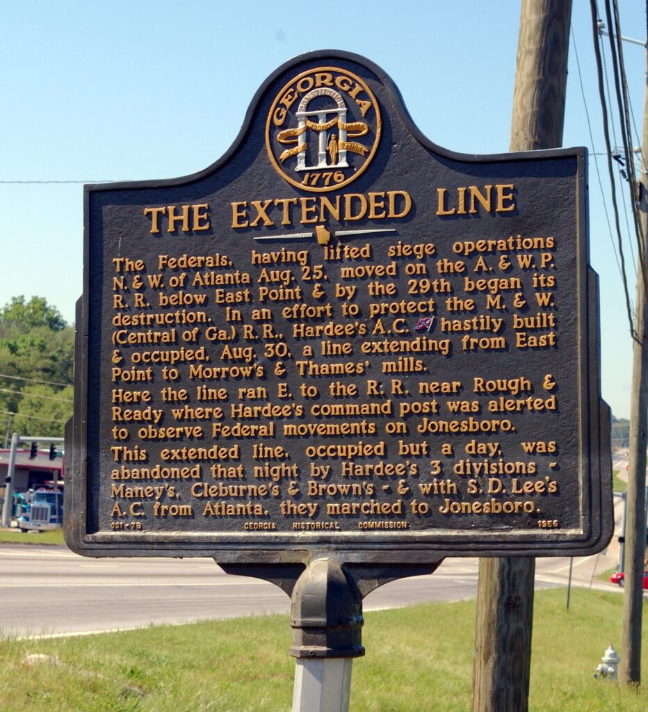 *Marker Text: The Federals, having lifted siege operations N. & W. of Atlanta Aug. 25, moved on the A. & W.P. R.R. below East Point & by the 29th began its destruction. In an effort to protect the M. & W. (Central of Georgia ) R.R., Hardee's A.C. [CS] built and occupied, Aug 30, a line extending from East Point to Morrow's & Thames' mills.
