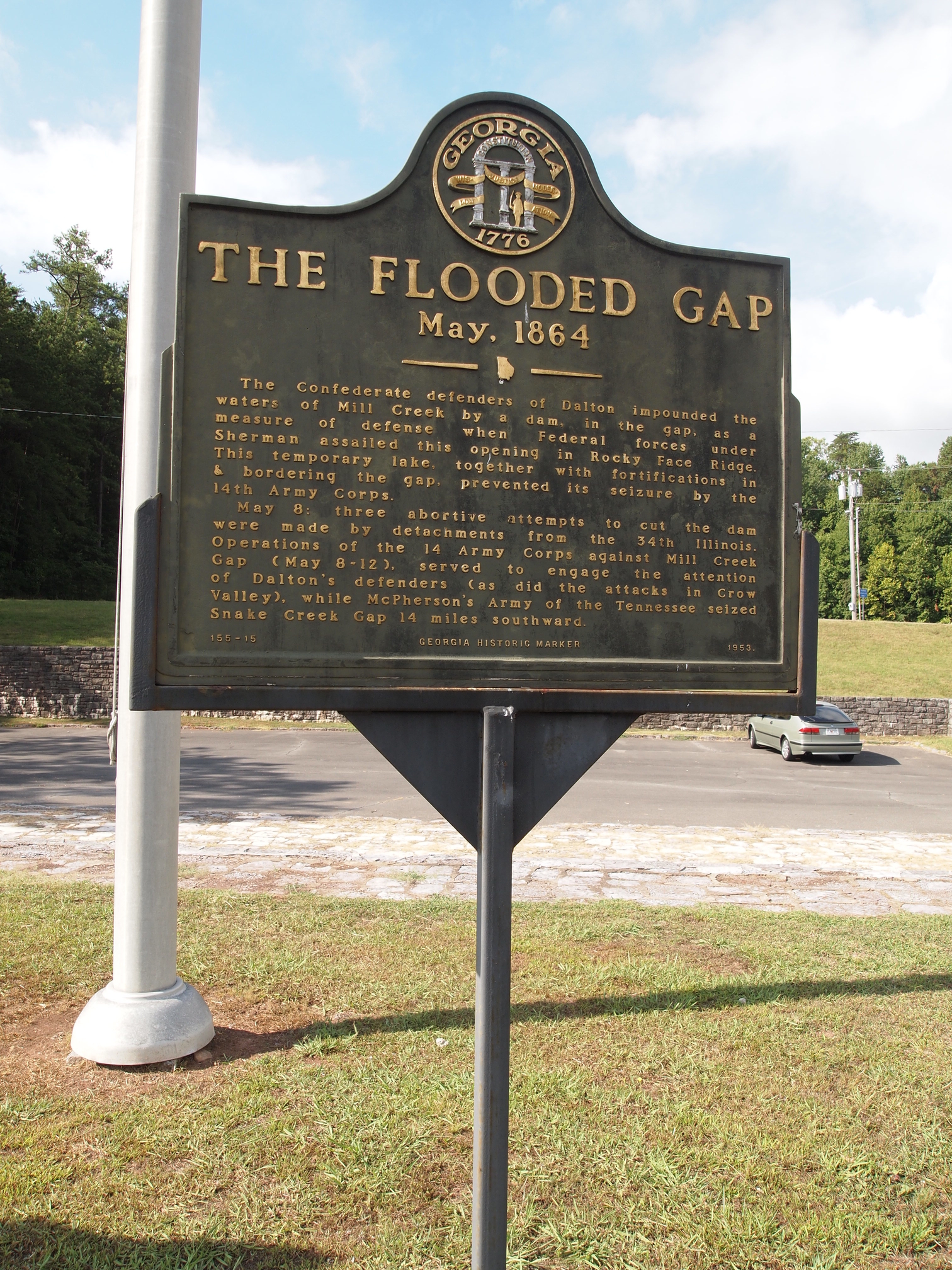 Marker Text: The Confederate defenders of Dalton impounded the waters of Mill Creek by a dam, in the gap, as a measure of defense when Federal forces under Sherman assailed this opening in Rocky Face Ridge. This temporary lake, together with fortifications in & bordering the gap, prevented its seizure by the 14th Army Corps.