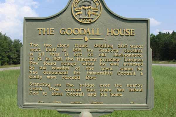 Marker Text: The two story frame dwelling 200 yards west, built in 1815 by Seaborn Goodall, is all that is left of old Jacksonboro. In it, in 1821, the itinerant preacher Lorenzo Dow found refuge when he was attacked by the rowdies of the town, whom he had denounced for immorality. Goodall, a Godly man, rescued Dow.