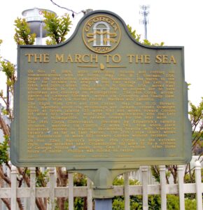 Marker Text: On Nov. 15, 1864, after destroying Atlanta and cutting his communications with the North, Maj. Gen. W.T. Sherman, USA, began his destructive campaign for Savannah--the March to the Sea. He divided his army (US) into two wings. The Left Wing (14th and 20th Corps), Maj. Gen. H.W. Slocum, USA, moved east from Atlanta in two columns, to feint at Augusta but to turn southeast and converge on Milledgeville. The 14th Corps accompanied by General Sherman, moved via Covington and Shady Dale, the 20th Corps via Social Circle, Madison and Eatonton.