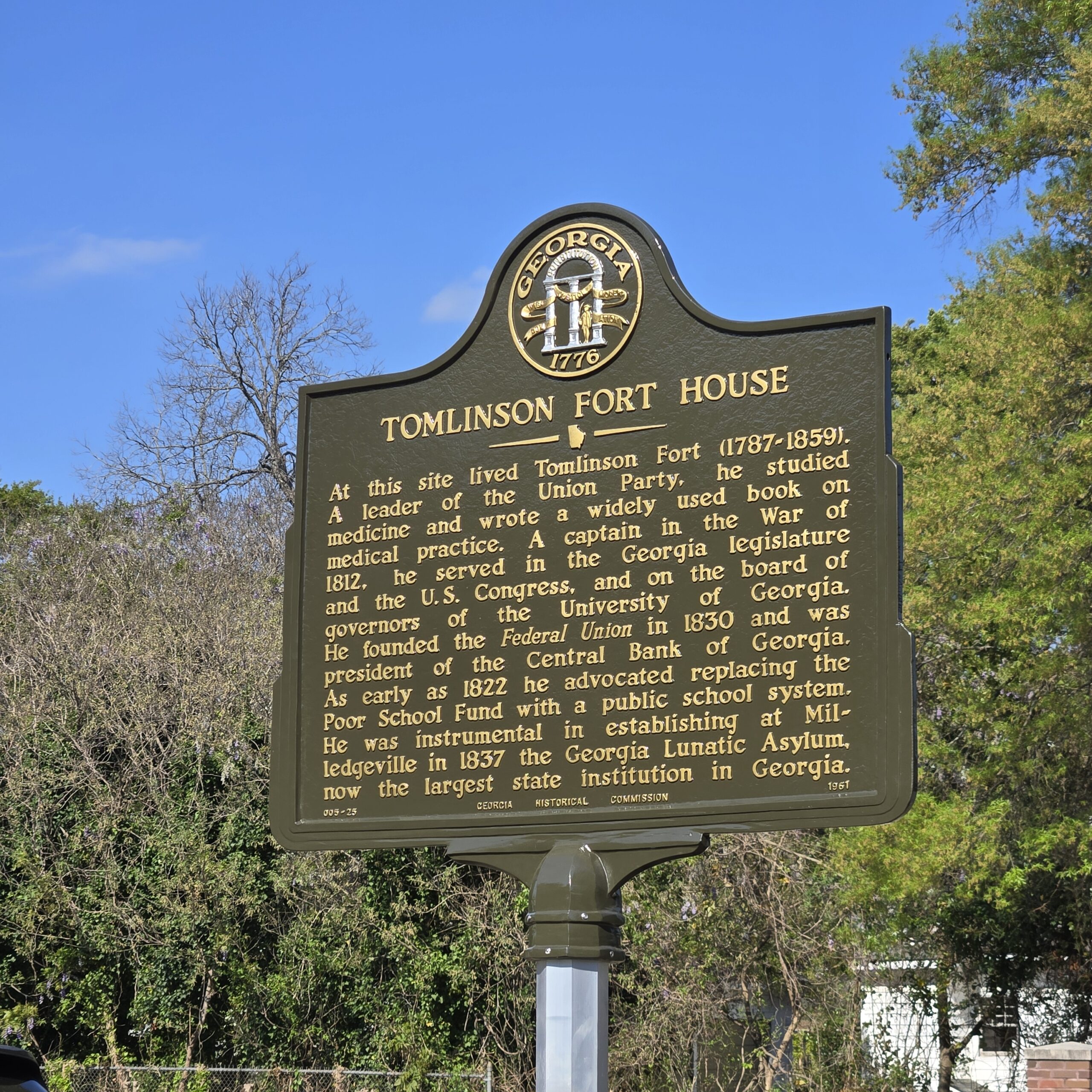 Marker Text: At this site lived Tomlinson Fort (1787-1859). A leader of the Union Party, he studied medicine and wrote a widely used book on medical practice. A captain in the War of 1812, he served in the Georgia legislature and the U.S. Congress, and on the board of governors of the University of Georgia. He founded the Federal Union in 1830 and was president of the Central Bank of Georgia. As early as 1822 he advocated replacing the Poor School Fund with a public school system. He was instrumental in establishing at Milledgeville in 1837 the Georgia Lunatic Asylum, now the largest state institution in Georgia.