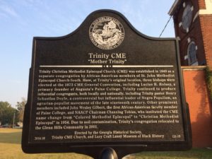 *Marker Text: Trinity Christian Methodist Episcopal Church (CME) was established in 1840 as a separate congregation by African-American members of St. John Methodist Episcopal Church-South. Here, at Trinity’s original location, three bishops were elected at the 1873 CME General Convention, including Lucius H. Holsey, a primary founder of Augusta’s Paine College. Trinity continued to produce influential congregants, both locally and nationally, including Trinity pastor Henry Sebastian Doyle, a controversial but influential leader of Negro Populism, an agrarian-populist movement of the late nineteenth century. Other prominent members included John Wesley Gilbert, the first African-American faculty member of Paine College, and NAACP Chairman Channing Tobias, who instituted the CME name change from “Colored Methodist Episcopal” to “Christian Methodist Episcopal” in 1954. Due to soil contamination, Trinity’s congregation relocated to the Glenn Hills Community in 2001.