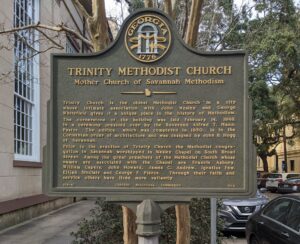 Prior to the erection of Trinity Church the Methodist congregation in Savannah worshipped in Wesley Chapel on South Broad Street. Among the great preachers of the Methodist Church whose names are associated with the Chapel are Francis Asbury, William Capers, John Howard, James C. Andrew, Ignatus Few, Elijah Sinclair and George F. Pierce. Through their faith and service others have lived more valiantly.