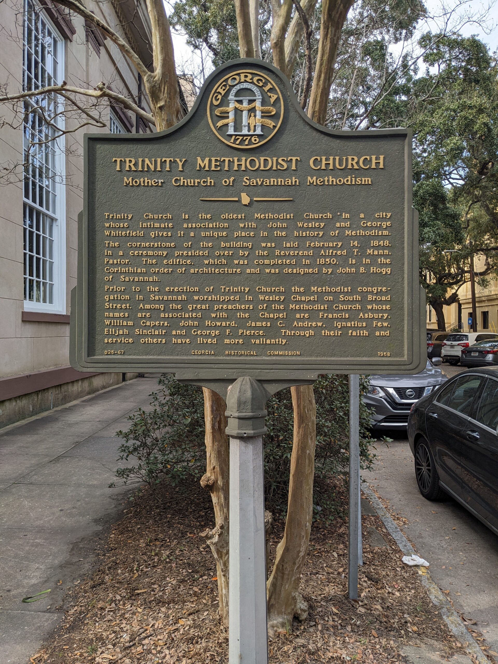 The cornerstone of the building was laid February 14, 1848, in a ceremony presided over by the Reverend Alfred T. Mann, Pastor. The edifice, which was completed in 1850, is in the Corinthian order of architecture and was designed by John B. Hogg of Savannah.
