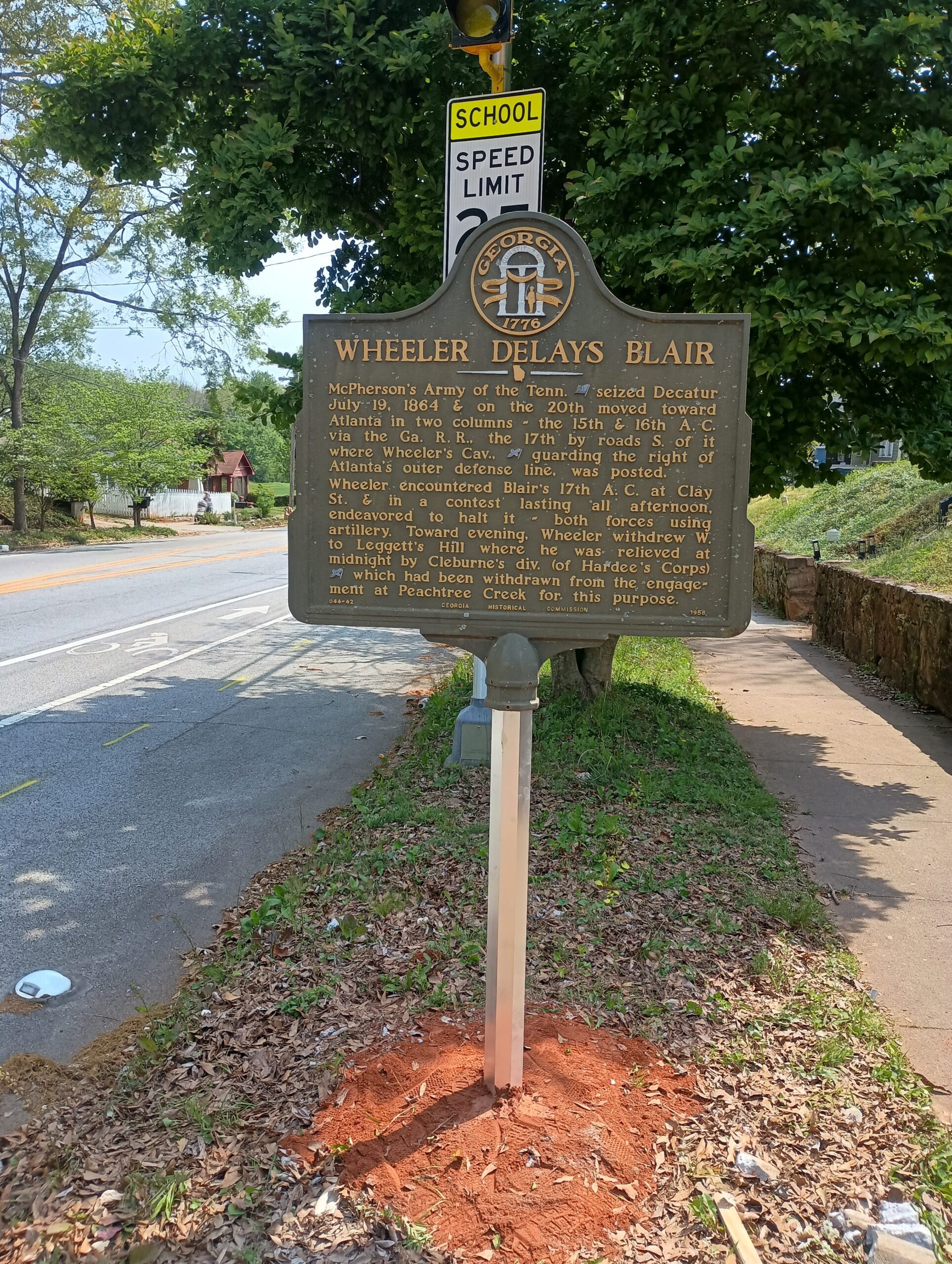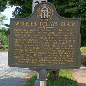 Marker Text: McPherson's Army of the Tenn. [US] seized Decatur July 19, 1864 & on the 20th moved toward Atlanta in two columns -- the 15th and 16th A.C. via the Ga. R.R., and the 17th by roads S. of it. Where Wheeler's Cav., [CS] guarding the right of Atlanta's outer defense line, was posted.