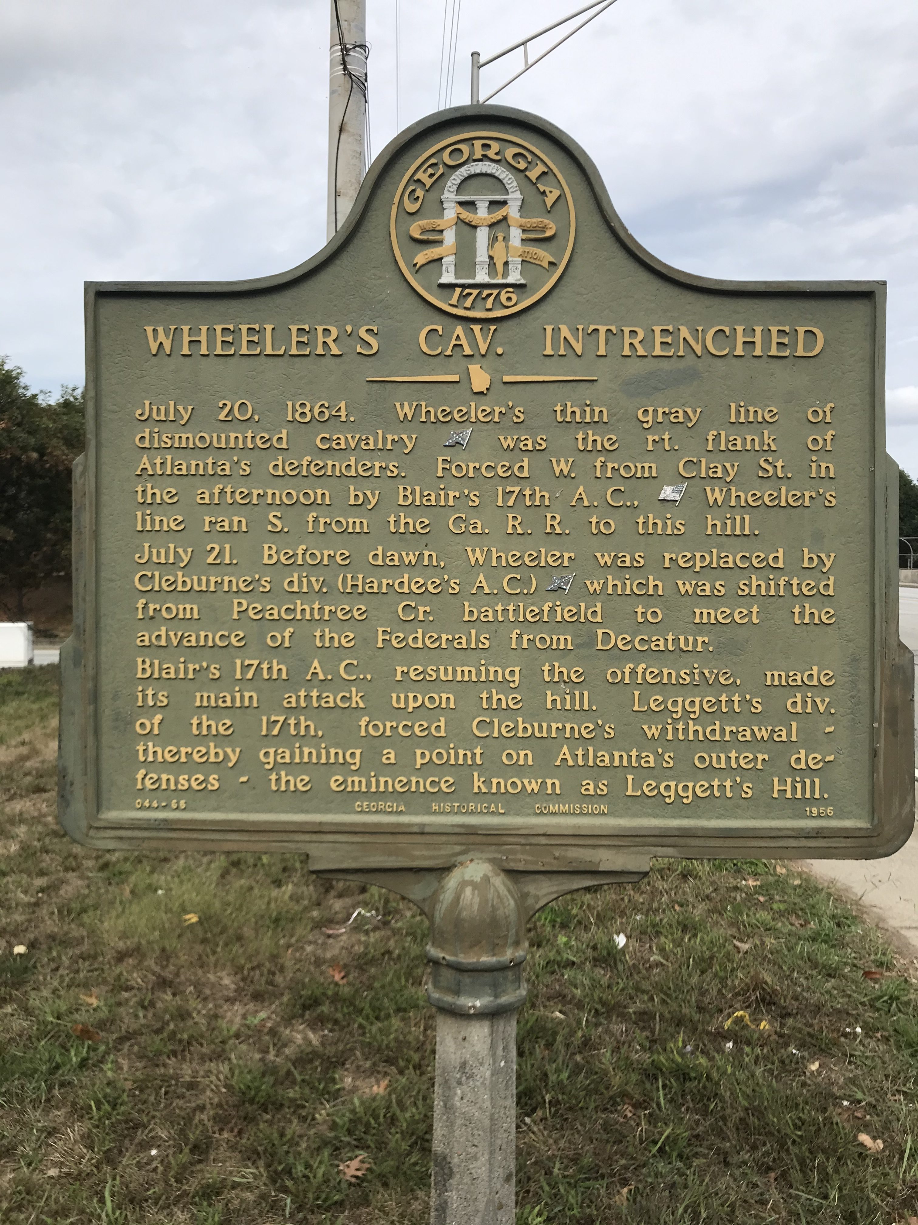 Marker Text: July 20, 1864. Wheeler's thin gray line of dismounted cavalry [CS] was the rt. flank of Atlanta's defenders. Forced W. from Clay St. in the afternoon by Blair's 17th A.C., [US] Wheeler's line ran S. from the Ga. R.R. to this hill.